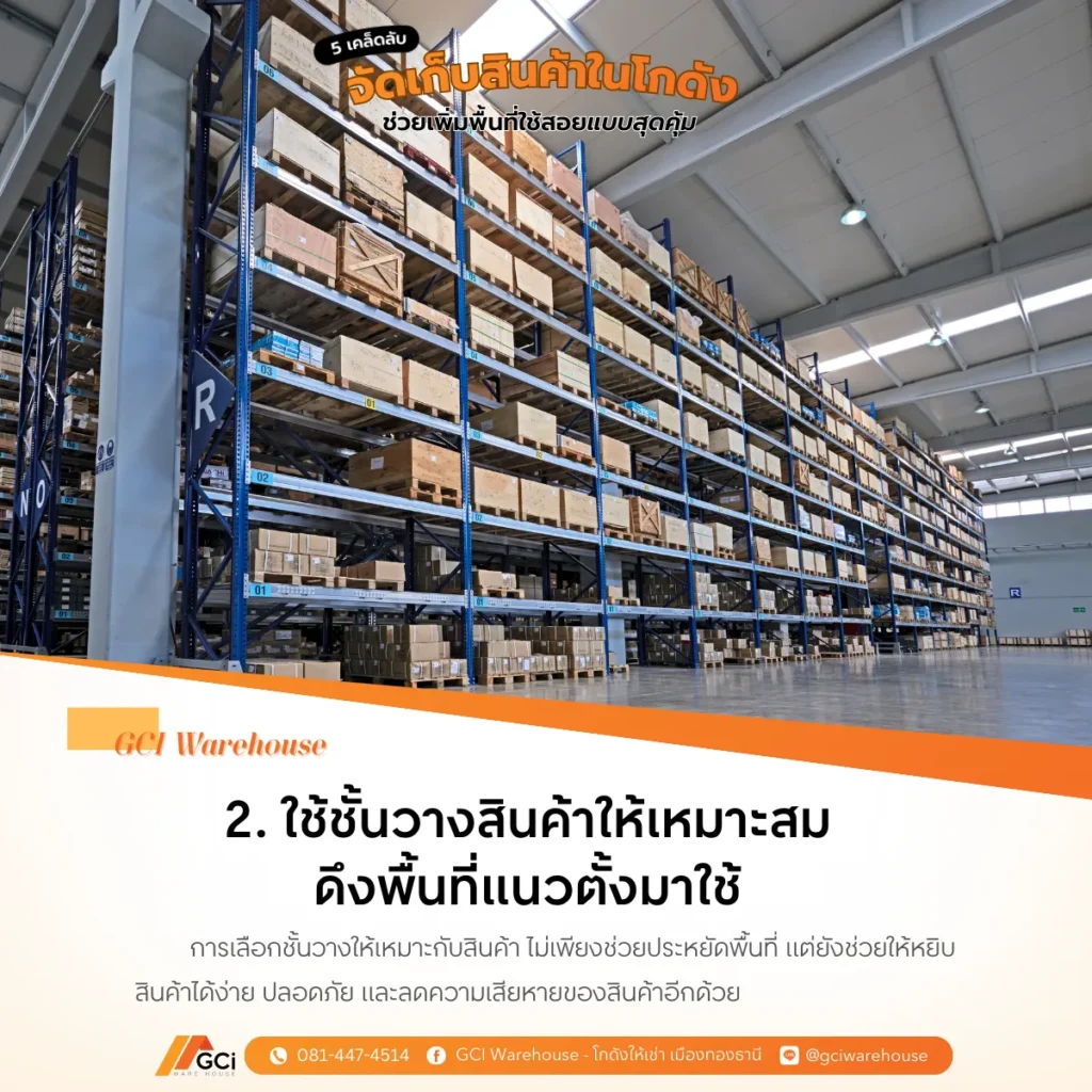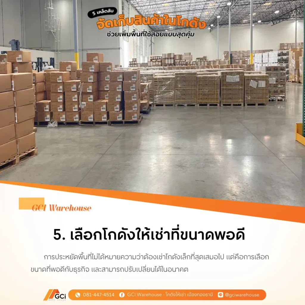 การจัดเก็บสินค้าในโกดังอย่างมีระบบไม่เพียงช่วยประหยัดพื้นที่ แต่ยังส่งผลโดยตรงต่อประสิทธิภาพการทำงาน ต้นทุน และภาพลักษณ์ของธุรกิจ 5 เคล็ดลับจัดเก็บสินค้าในโกดังให้ประหยัดพื้นที่สูงสุด วางผังโกดังให้เหมาะกับลักษณะสินค้า , ใช้ชั้นวางและพื้นที่แนวตั้งอย่างเต็มที่ , จัดหมวดหมู่สินค้าให้ชัดเจน , ใช้ระบบ WMS ช่วยบริหารพื้นที่และเลือกโกดังให้เช่าที่ขนาดพอดีและยืดหยุ่น หากคุณกำลังมองหาโกดังที่พร้อมรองรับการเติบโตของธุรกิจในอนาคต การเลือก GCI Warehouse โกดังให้เช่าเมืองทองธานี อาจเป็นจุดเริ่มต้นที่ช่วยให้ธุรกิจของคุณเดินหน้าได้อย่างมั่นคงและมีประสิทธิภาพค่ะ