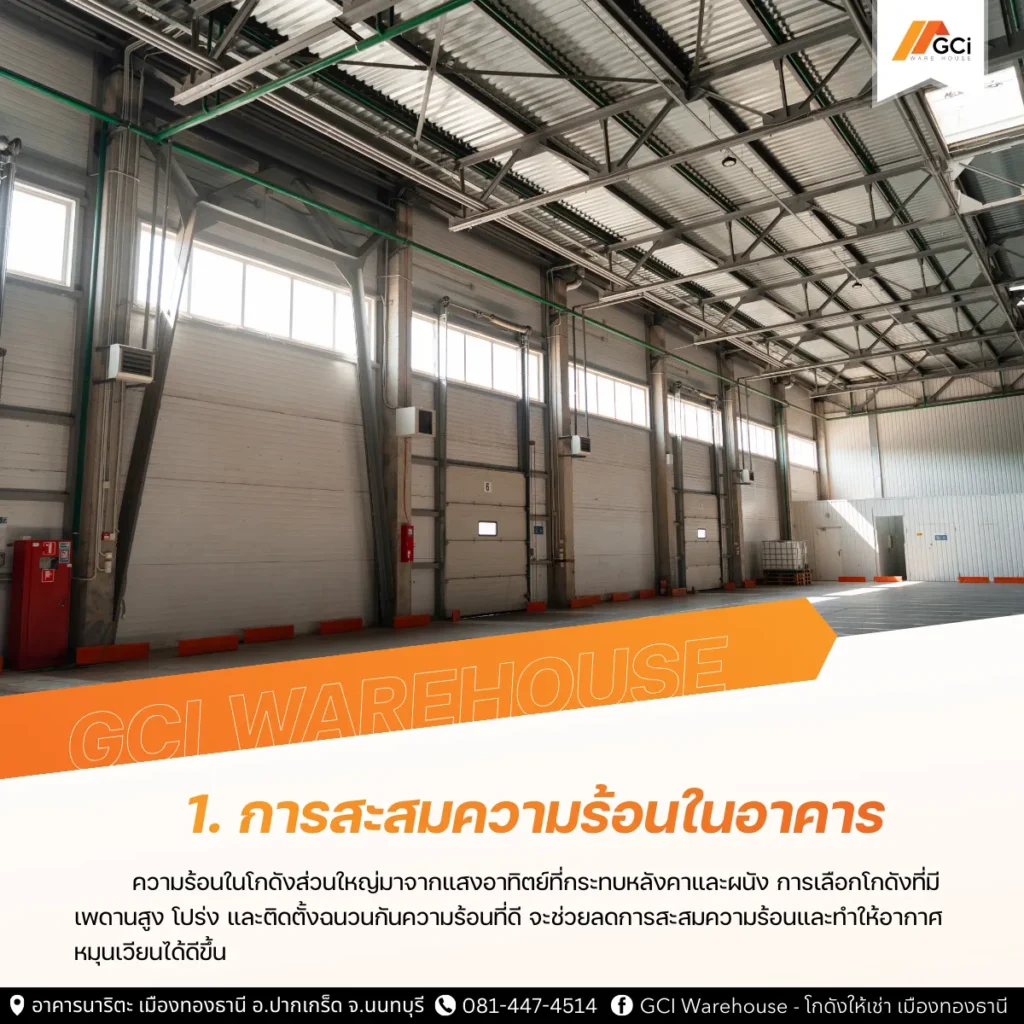 ก่อนจะรู้วิธีป้องกันเราต้องเข้าใจก่อนว่าความร้อนเข้าสู่โกดังได้อย่างไร ความร้อนส่วนใหญ่มาจากรังสีอาทิตย์ที่ตกกระทบหลังคาและผนัง ซึ่งวัสดุอย่างเมทัลชีททั่วไปหากไม่มีฉนวนกันความร้อนที่ดี จะทำหน้าที่เป็นเหมือนเตาอบขนาดใหญ่ที่แผ่ความร้อนลงสู่สินค้าด้านล่างตลอดทั้งวัน การเลือกโกดังที่มีเพดานสูงและการติดตั้งฉนวนกันความร้อนคุณภาพสูงจึงเป็นด่านแรกที่สำคัญที่ GCI Warehouse โกดังให้เช่าของเราอยู่ชั้น 9 ค่ะ ไม่ต้องรับแดดโดยตรงทำให้ลดการสะสมของมวลความร้อนในโกดัง