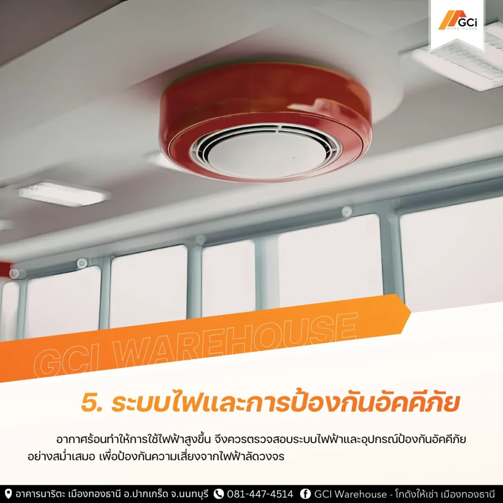 หน้าร้อนไม่ได้มาแค่ความร้อนแต่มาพร้อมกับความแห้งแล้งและภาระการใช้ไฟฟ้าที่สูงขึ้นจากพัดลมหรือระบบทำความเย็น ซึ่งเพิ่มความเสี่ยงต่อการเกิดไฟฟ้าลัดวงจร การตรวจสอบระบบสายไฟภายในโกดังเป็นประจำจึงเป็นเรื่องที่ละเลยไม่ได้ โกดังที่ดีต้องมีระบบป้องกันอัคคีภัยที่ได้มาตรฐาน มีถังดับเพลิงที่พร้อมใช้งานและมีการซักซ้อมแผนฉุกเฉิน ซึ่งที่โกดังเรามีทั้งกล้องวงจรปิดและเครื่องตรวจจับความร้อนเลยค่ะ ทำให้ผู้ประกอบการสามารถมั่นใจได้ว่าสินค้าของคุณจะปลอดภัยอย่างแน่นอน