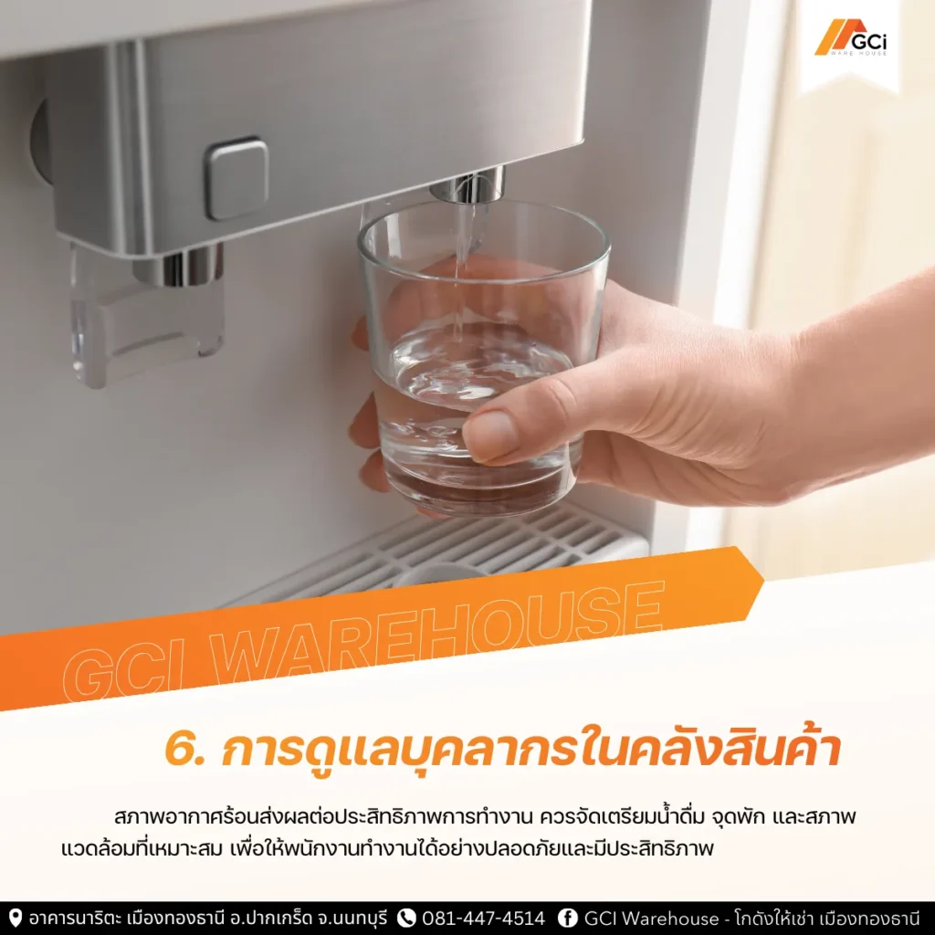 สินค้าจะปลอดภัยได้คนดูแลต้องพร้อมด้วย ความร้อนที่สูงเกินไปส่งผลต่อสมาธิและความเหนื่อยล้าของพนักงานคลังสินค้า ซึ่งอาจนำไปสู่ความผิดพลาดในการหยิบสินค้าหรืออุบัติเหตุระหว่างเคลื่อนย้าย การจัดเตรียมน้ำดื่มสะอาด การกำหนดช่วงเวลาพักที่เหมาะสมและการสร้างสภาพแวดล้อมที่เย็นสบายจะช่วยรักษาประสิทธิภาพการทำงานไว้ได้