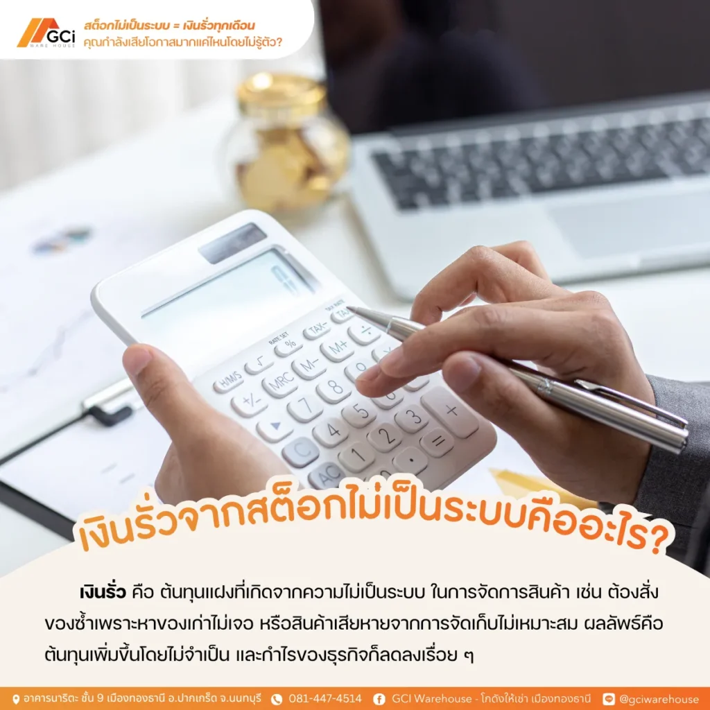 เงินรั่วในที่นี้ไม่ได้หมายถึงการโดนโกงหรือสูญเงินสดทันที แต่คือ ต้นทุนแฝงที่เกิดจากความไม่เป็นระบบ ในการจัดการสินค้า เช่น ต้องสั่งของซ้ำเพราะหาของเก่าไม่เจอ , สินค้าเสียหายจากการจัดเก็บไม่เหมาะสม , เสียเวลาและค่าแรงพนักงานในการหาของ , ขนย้ายสินค้าหลายรอบเพราะจัดเรียงไม่ดี , ไม่รู้ปริมาณสินค้าคงเหลือที่แท้จริง ทำให้วางแผนการขายผิด ผลลัพธ์คือต้นทุนเพิ่มขึ้นโดยไม่จำเป็น และกำไรของธุรกิจก็ลดลงเรื่อย ๆ โดยที่เจ้าของอาจไม่รู้ตัวเลยว่าต้นตอมาจากการไม่มีโกดังเก็บของที่ดี